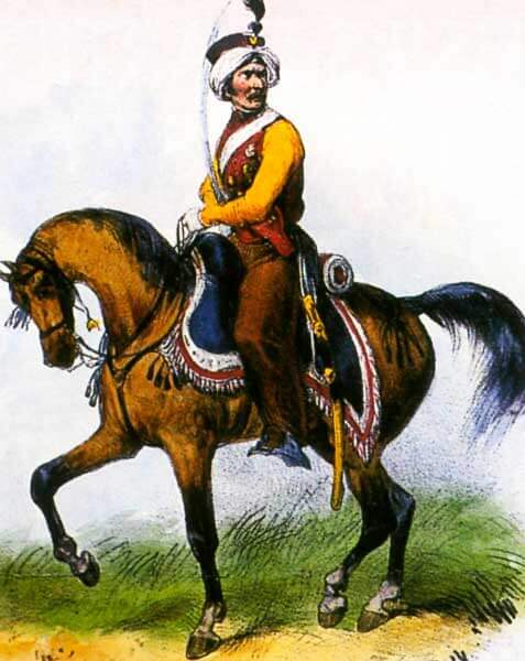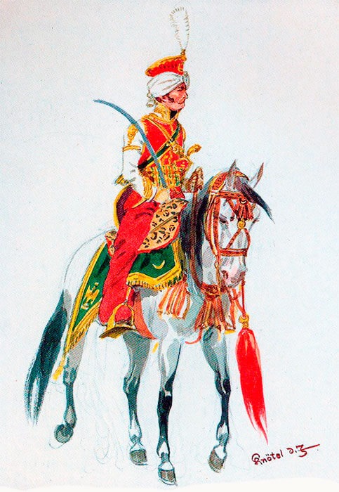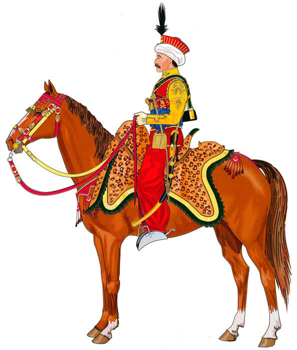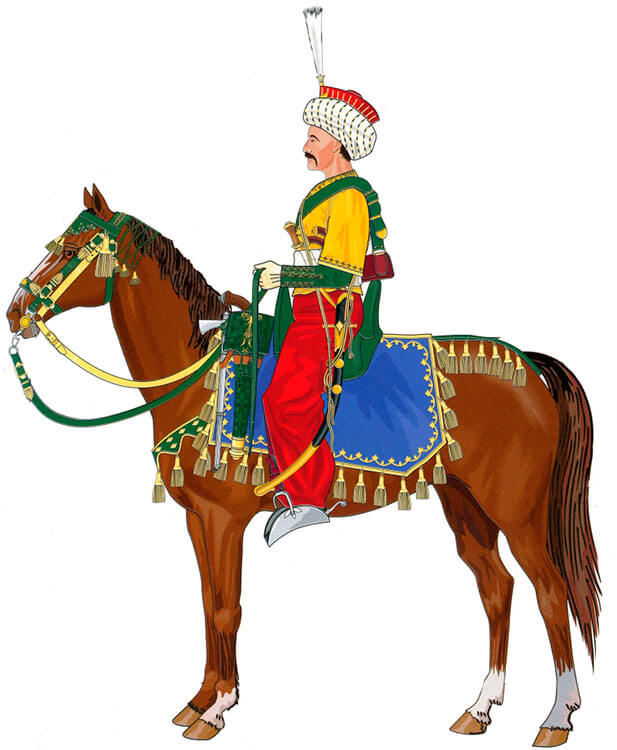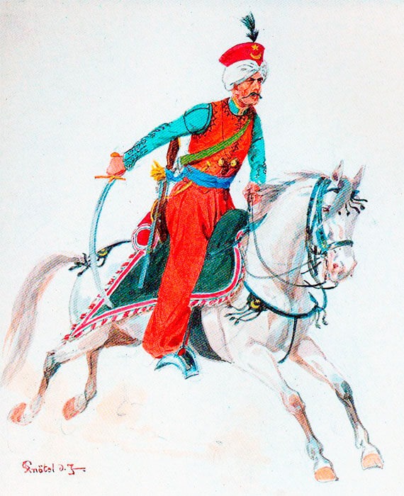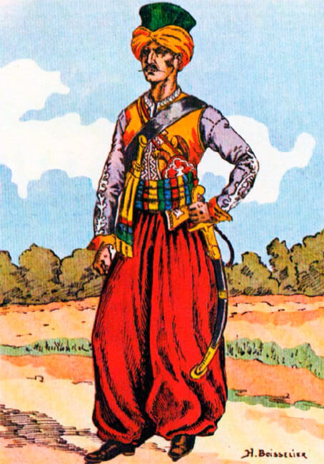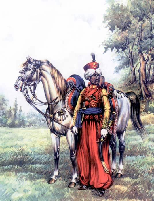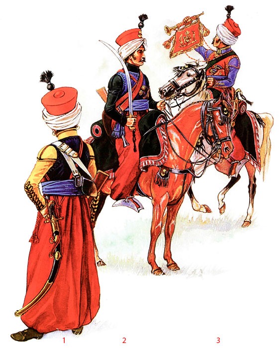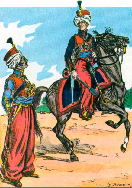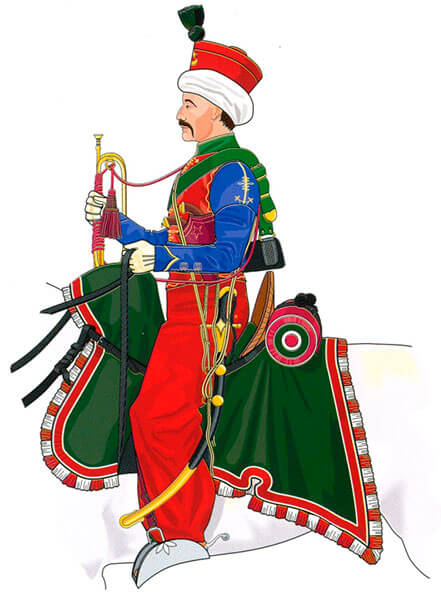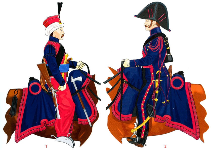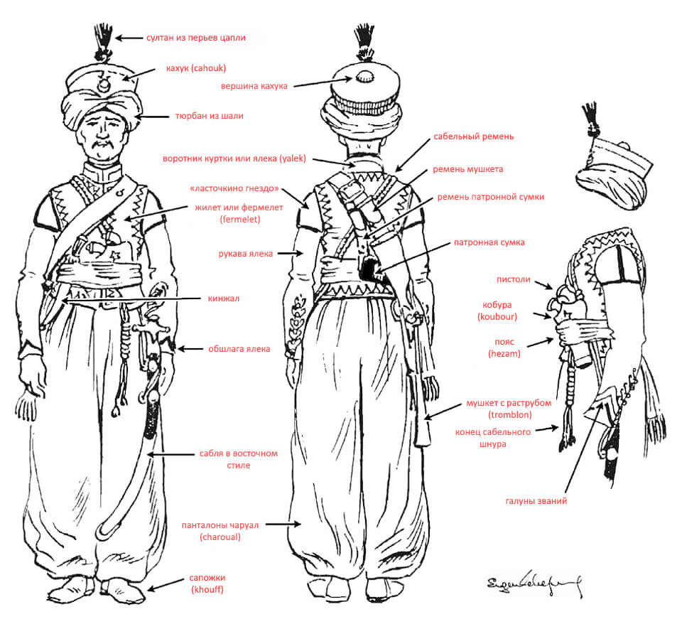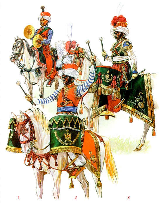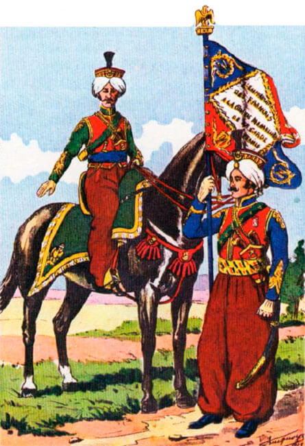 Они будут ездить верхом, как и лёгкая кавалерия, и, в знак награды за верность французской армии, будут носить зелёный кахук и белый тюрбан. (A.N. AF IV 60/343).