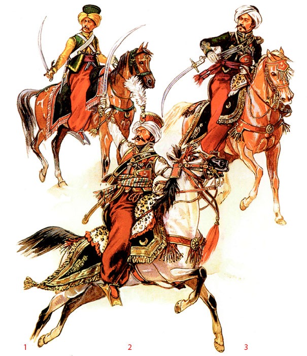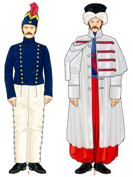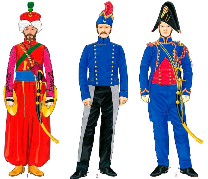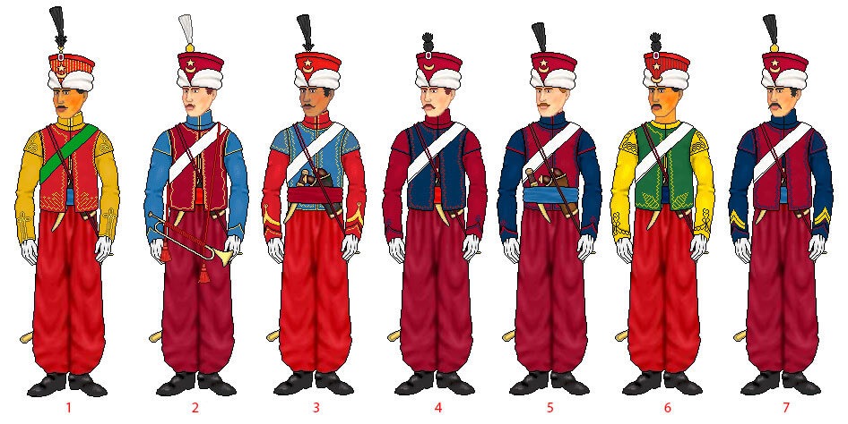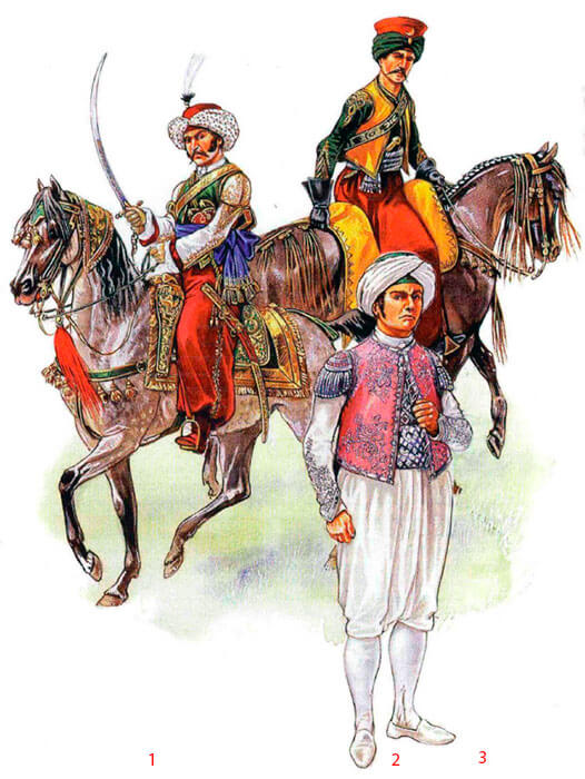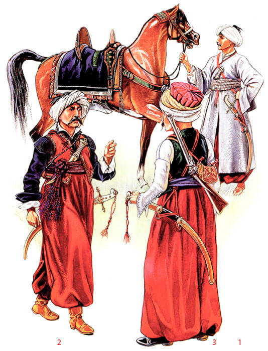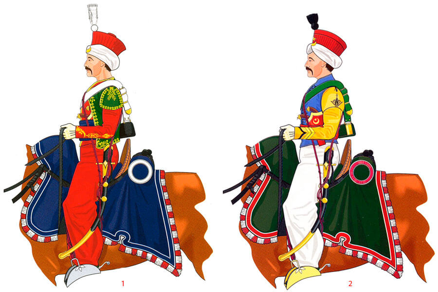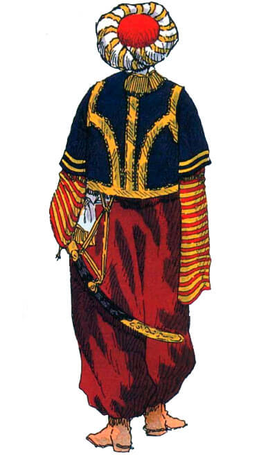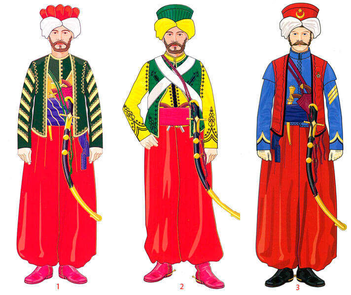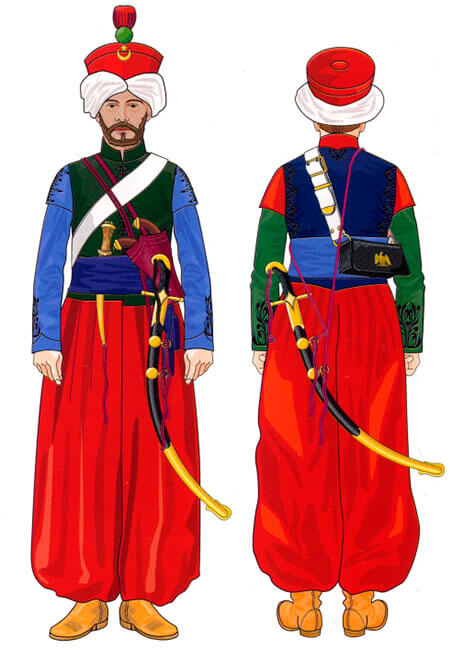 Костюм типичный для раннего периода. Он во многом соответствует одеянию, которое носили в Египте. Большой тюрбан намотан вокруг небольшой шапочки. Короткая куртка с широкими рукавами до локтя надета поверх рубахи с длинными рукавами. Как рубаха, так и куртка богато расшиты золотой нитью. Белый плюмаж из перьев характерен для турок-офицеров.2: Офицер в летней униформе.