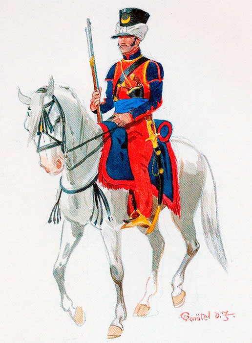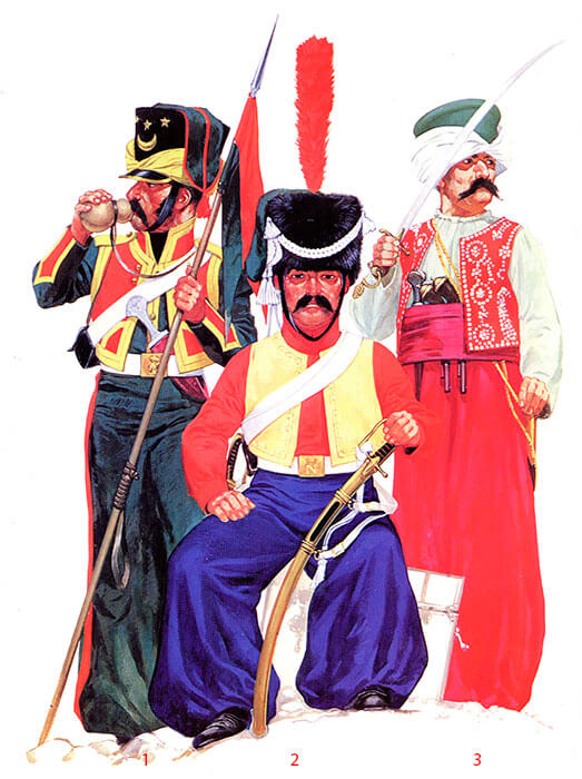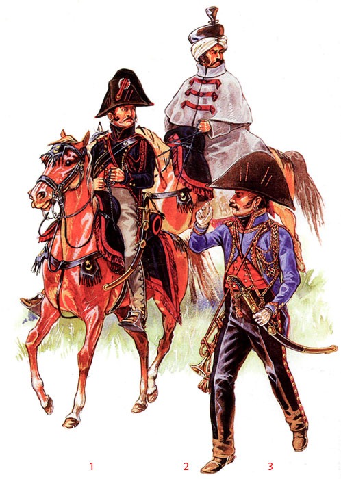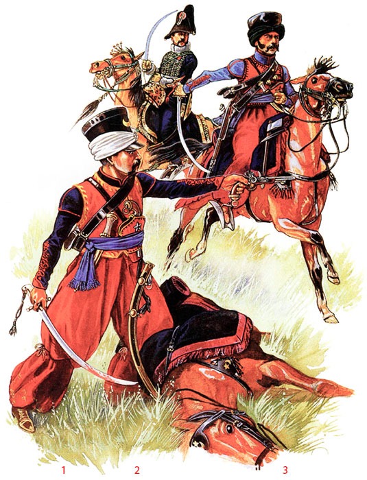 1 — мамелюк в одежде «восточного стиля» во время Германской кампании 1813 года. Цвет шабрака — синий, а не зеленый, как обычно;