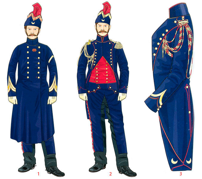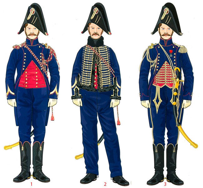 3 — трубач во «французской» униформе. Мундир небесно-голубого цвета. Воротник, лацканы и обшивка украшены тесьмой, которая кажется смесью золотой и малиновой тесьмы. То же самое можно сказать о трилистнике (погонах) и аксельбанте.