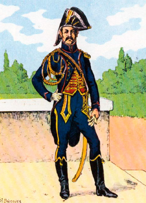 В коллекции Dubois de l’Etang есть еще одна версия литаврщика: седельная ткань зеленая с золотой тесьмой и бахромой. Шаровары красные, а жилет зеленый и очень богато расшит золотом по всем швам.